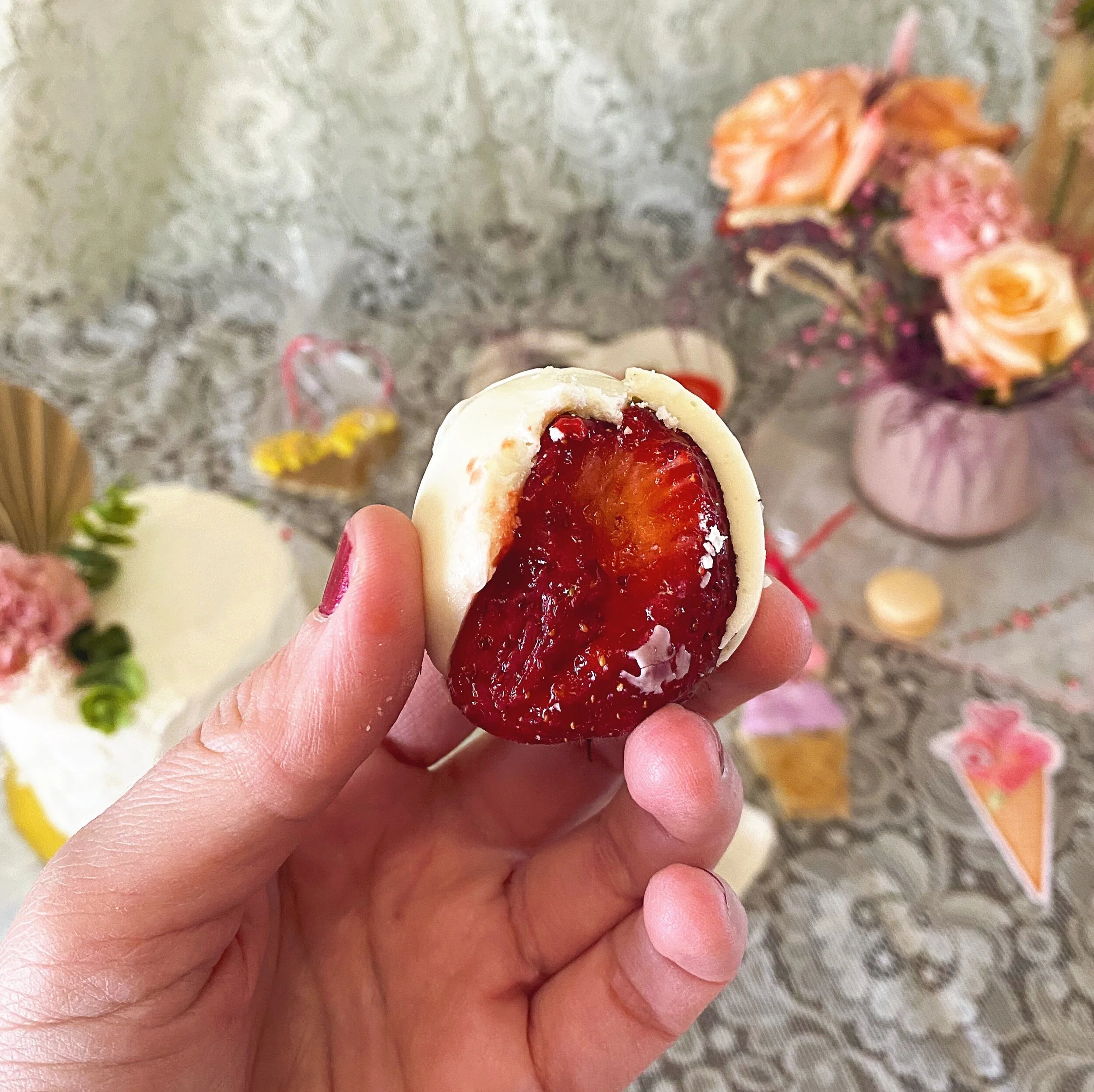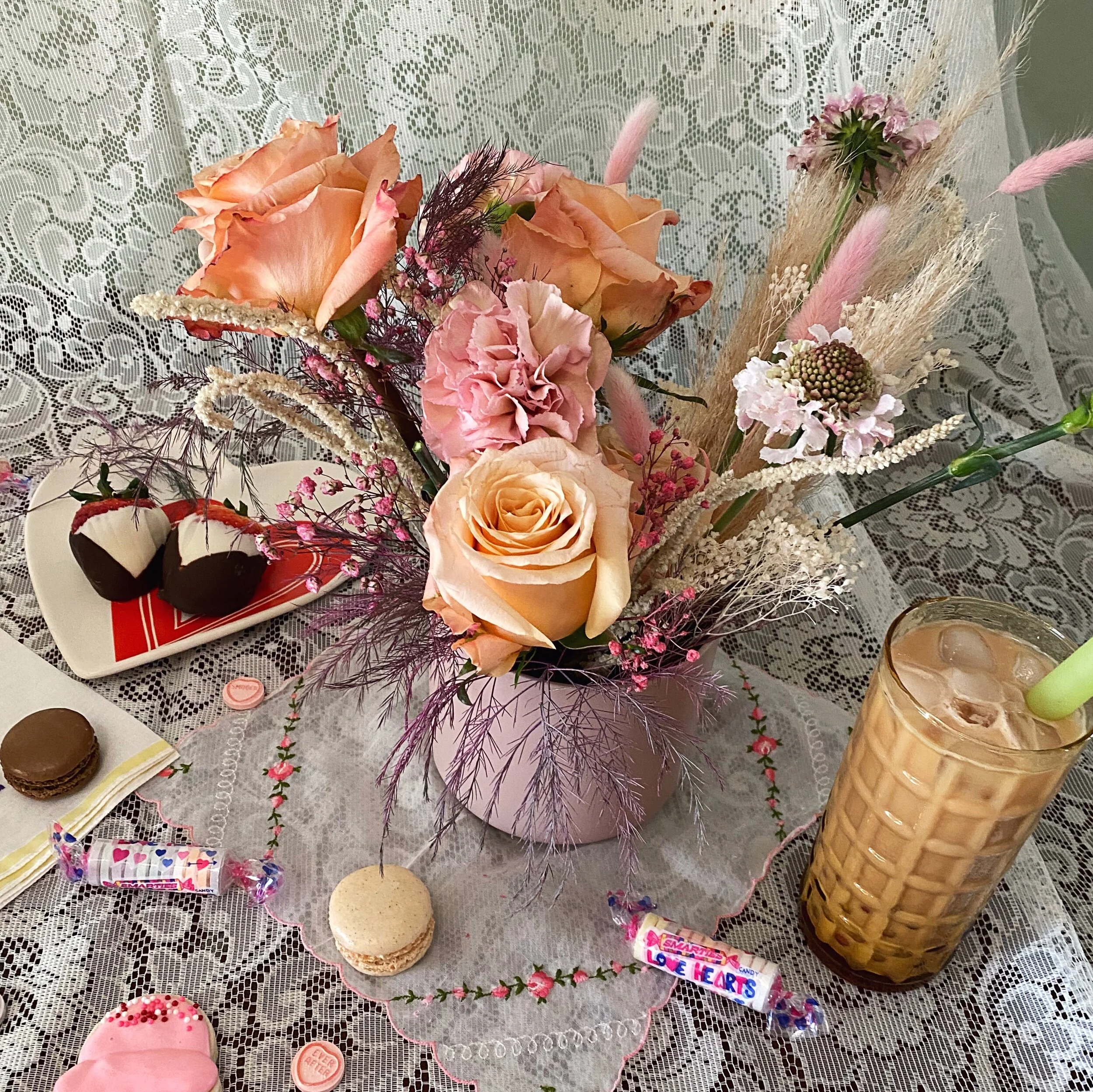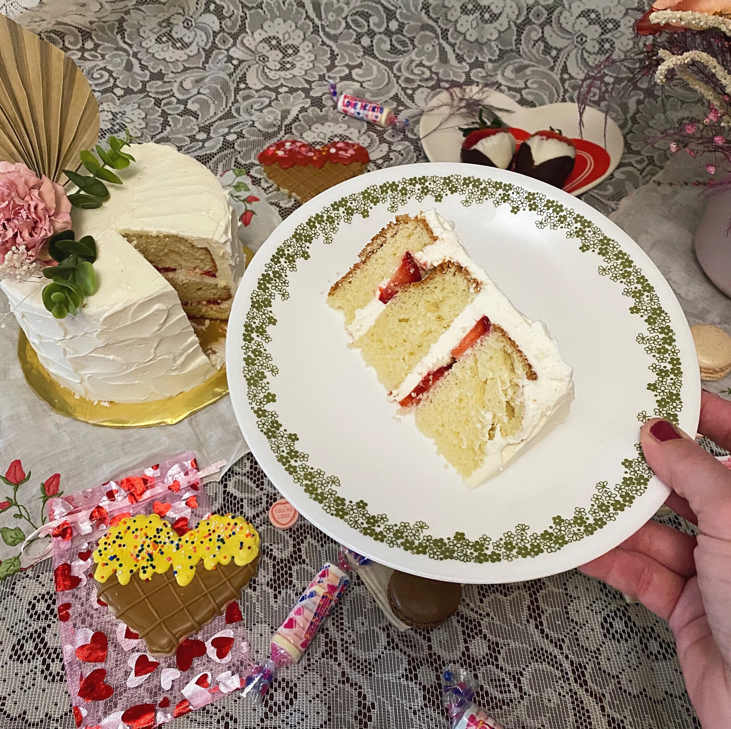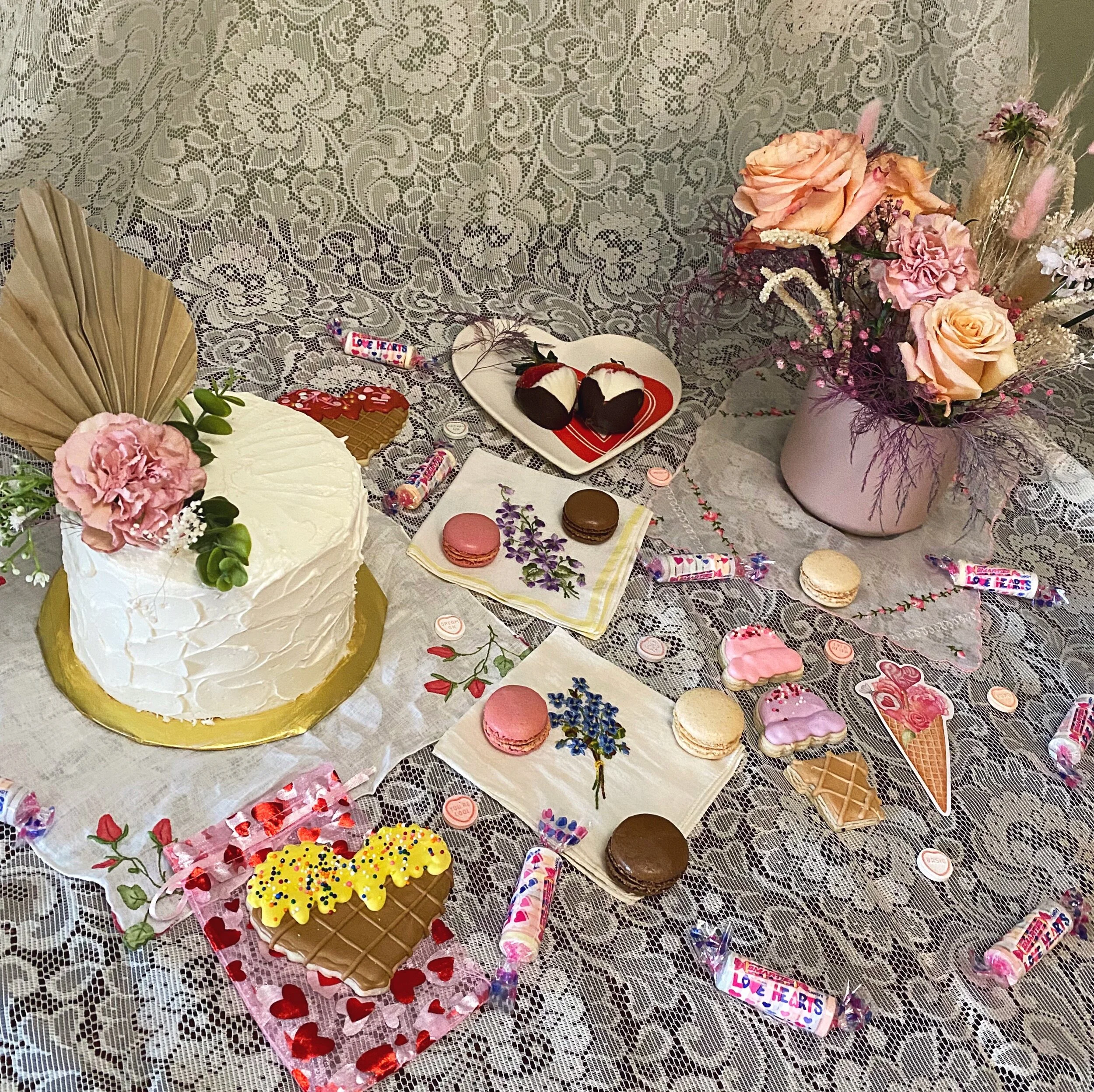 Here’s how it went. First I ordered a variety pack from her popup that included an arrangement from Elizabeth McKenzie Florals, chocolate-covered strawbs, and macarons. Great! Perfect. Enough?? I thought so, until Taylor kept posting about it and it all looked soooo good… I ordered a cake at the last minute. White strawberry. Fun fact: The first time I’ve paid for one of her cakes! Glad I am finally putting my money where my mouth is!!