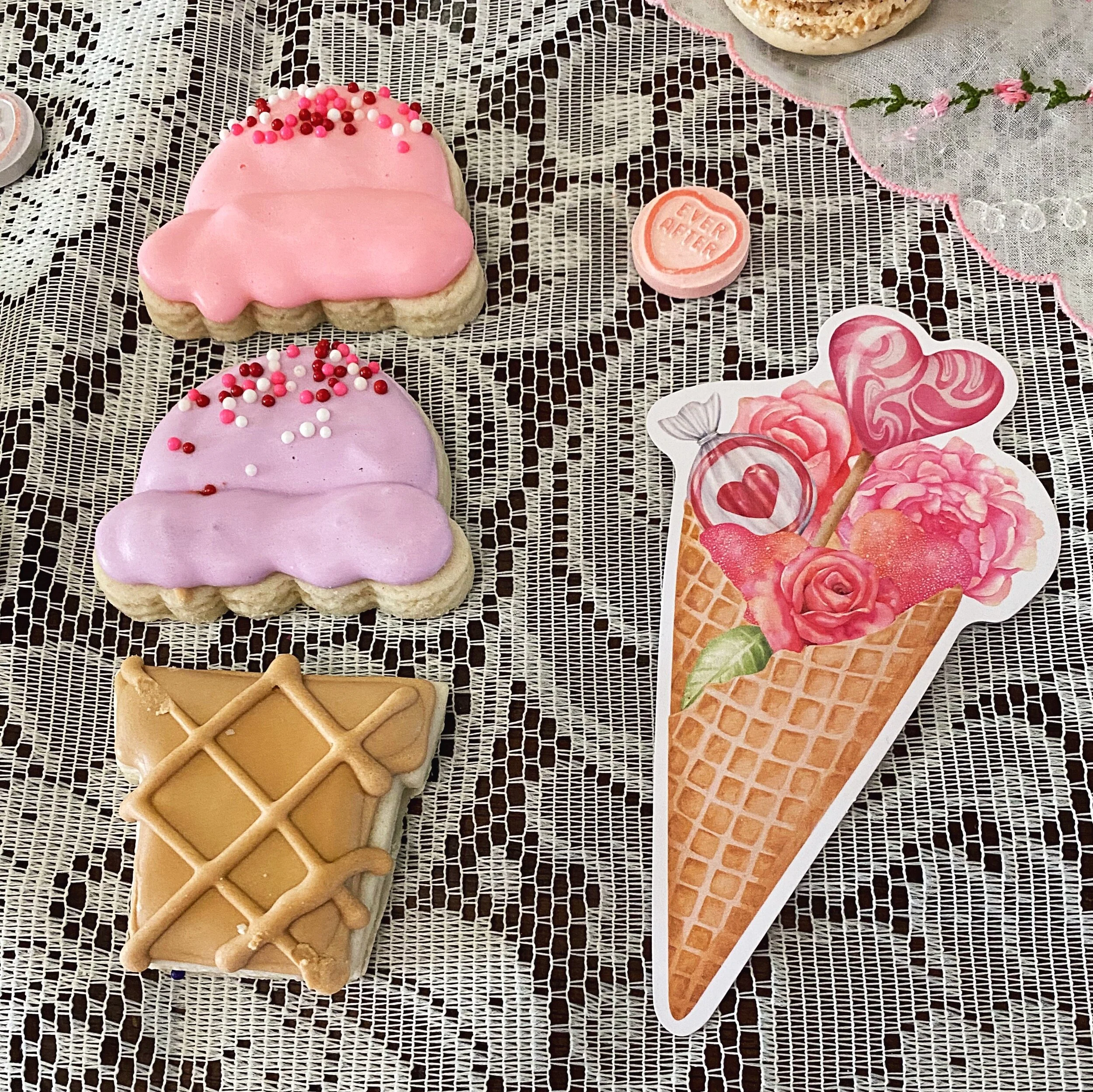 Then…………. the day before I was due to pick up my items, Taylor had a big popup event with lots of expertly decorated goodies. While I didn’t make it to the event, I DID make it to instagram where she listed the leftovers and I snatched up three spectacular sugar cookies decorated to look like ice cream cones!!!! Y’all, they are so pretty they’re hard to EAT. And you know how much I love to eat desserts!