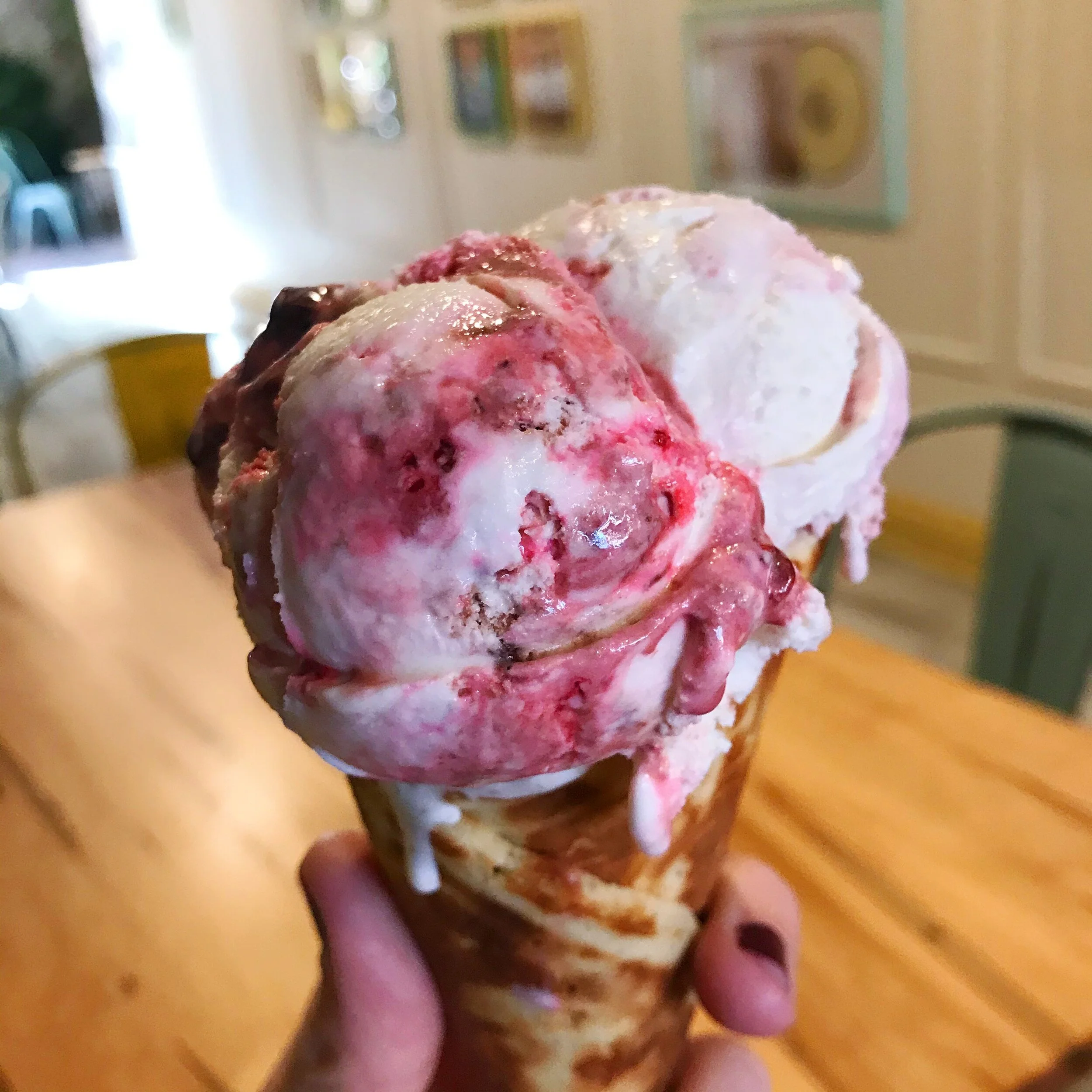 One of my favorite things about Betty Rae’s is that you can divide the scoops up into smaller portions. Here I ordered a “big scoop" and divided it into 3 mini-scoops for a festive sampler. Santa’s milk and cookies is in the cone (described as seven types of fresh baked cookies swirling in a sweet cream base), our friend peppermint bark is on the left, and the right is the surprisingly delicious sweet cranberry swirl. The cranberry was very lovely and photogenic but can’t compare to the beauty that is peppermint bark if you ask me. Ha!