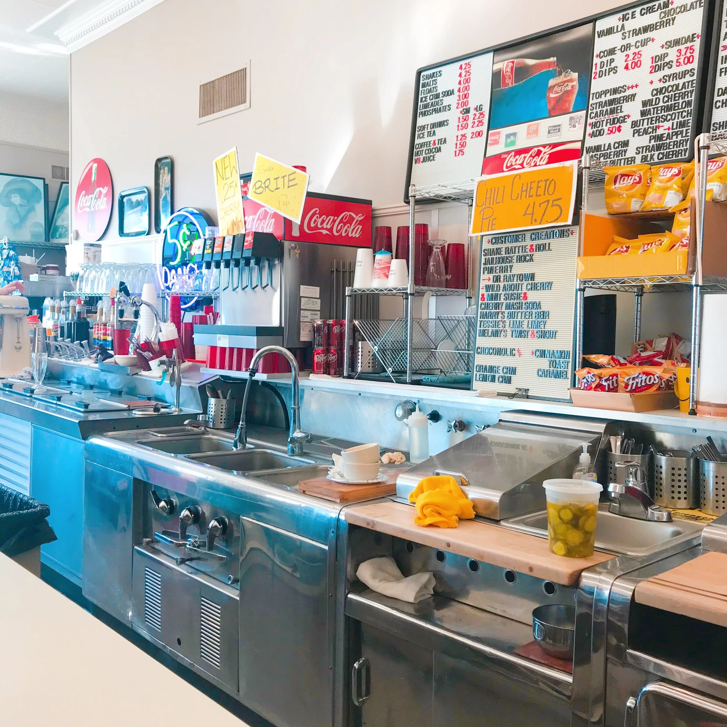 Can’t go wrong with a chocolate malt! The 3-headed shake machine (faaar left in the next pic) is original to the establishment, and is lovingly maintained by Nancy with the help of a repair person she found in rural Kansas.