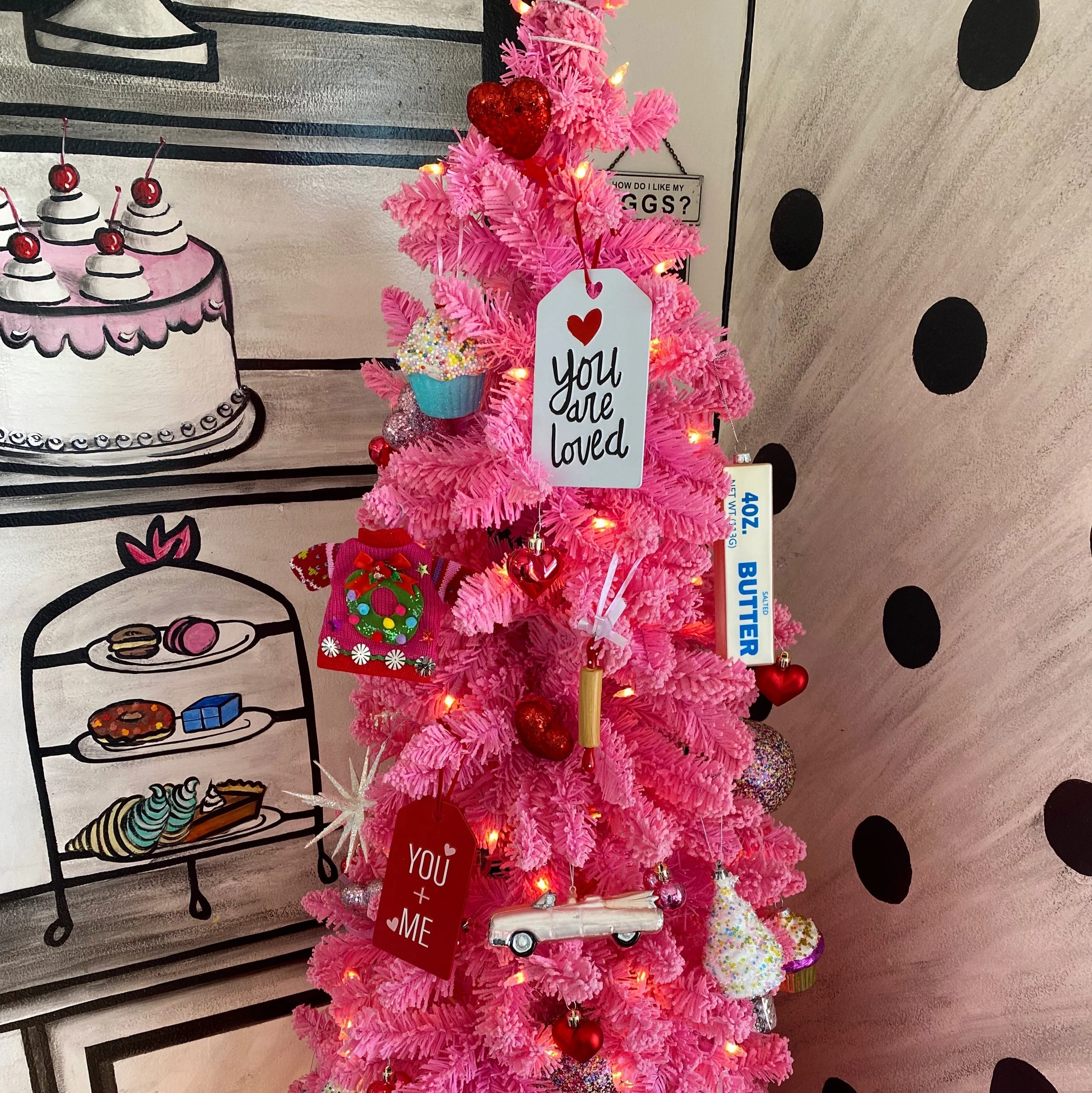 First, let’s talk vibes. You know I love an aesthetic. Mad Cakes’ pink exterior had me quite intrigued well before the storefront opened. Inside you’ll find a ceiling decorated with sprinkles; hand-painted murals on ever wall; and a pink Christmas tree year-round with seasonal and treats-themed ornaments. Sweet Tooth Tracy catnip, is the overall effect! Throw in delicious desserts and spectacular service and you have no idea how much restraint it takes to not stop in every time I drive by (which is frequently).