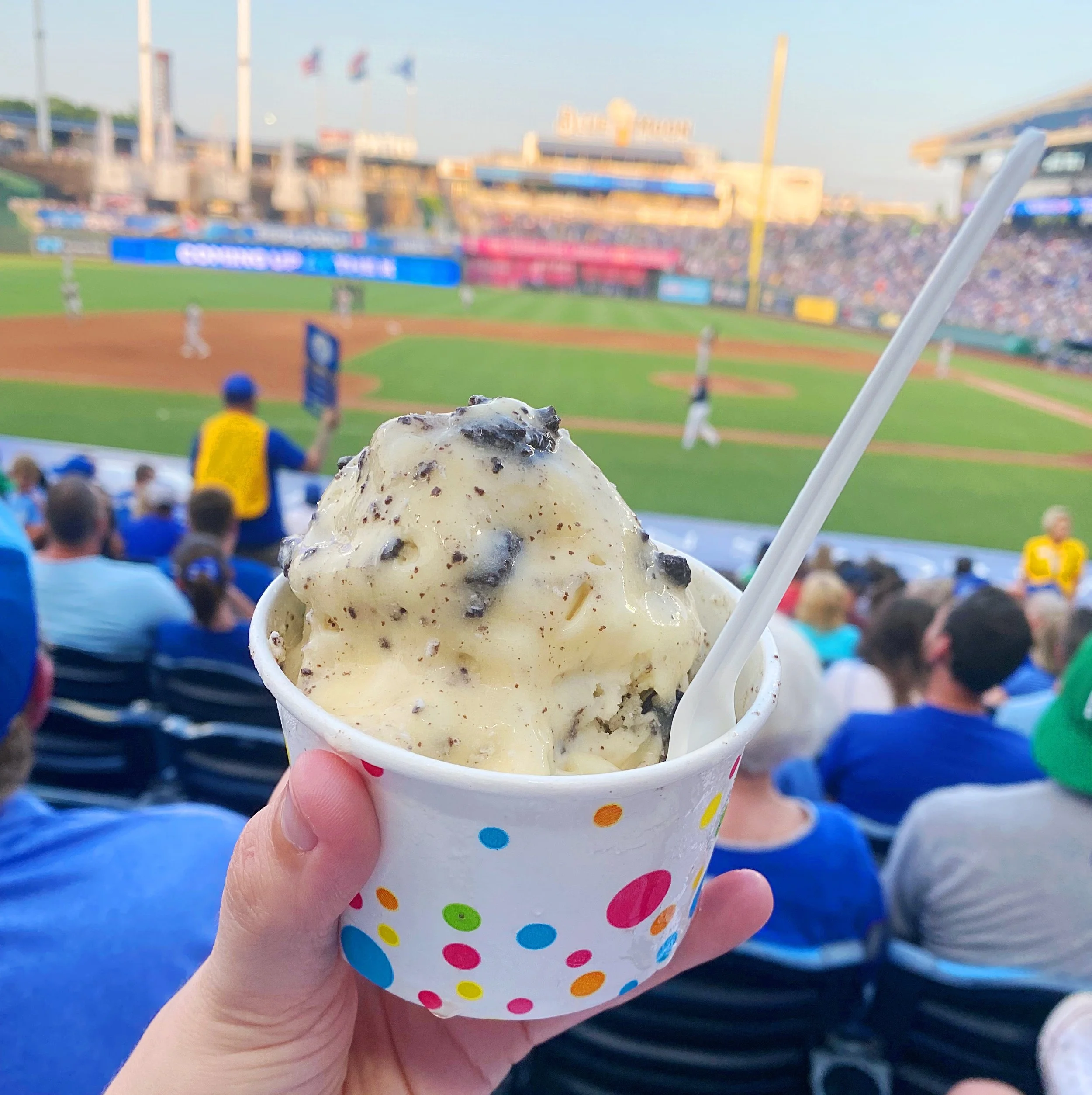 Ok, here’s the deal. I went to a Royals game and got a blue raspberry limeade and an accidental double order of French fries and an ice cream. I have no idea what the vendor of the ice cream is called (a sign read “KC Baking Company” which is impossible to google) but here’s the stadium dining guide and it was on the first floor behind the diamond club (?). Let’s get into it!
